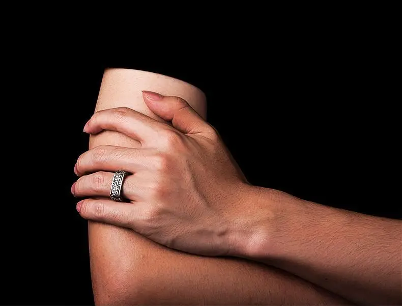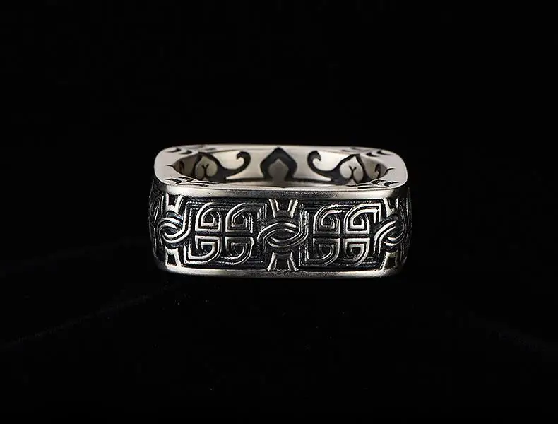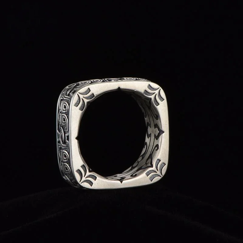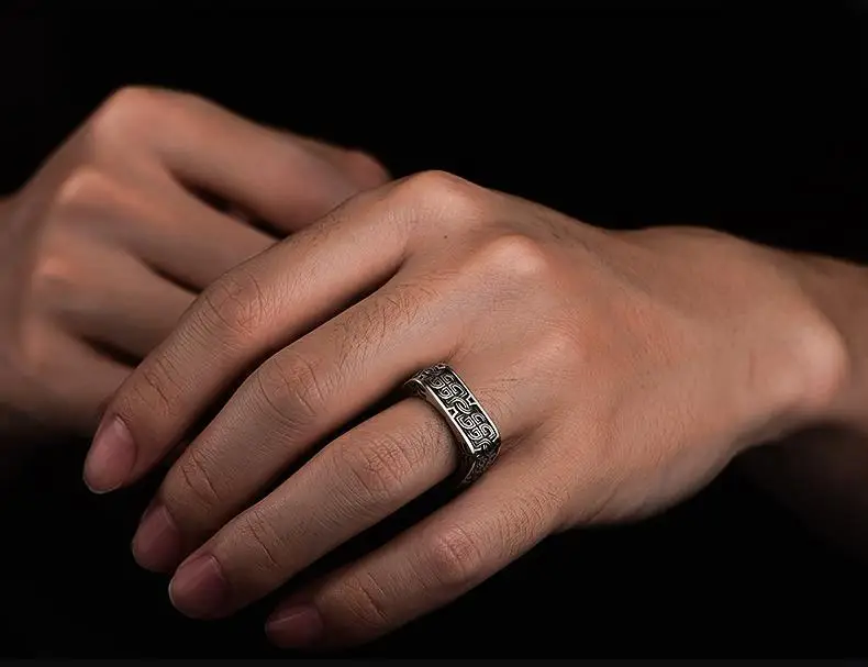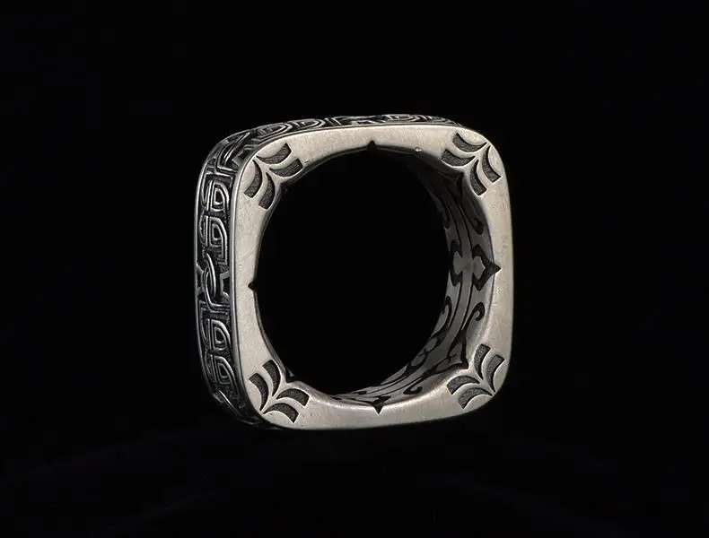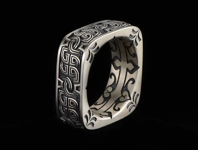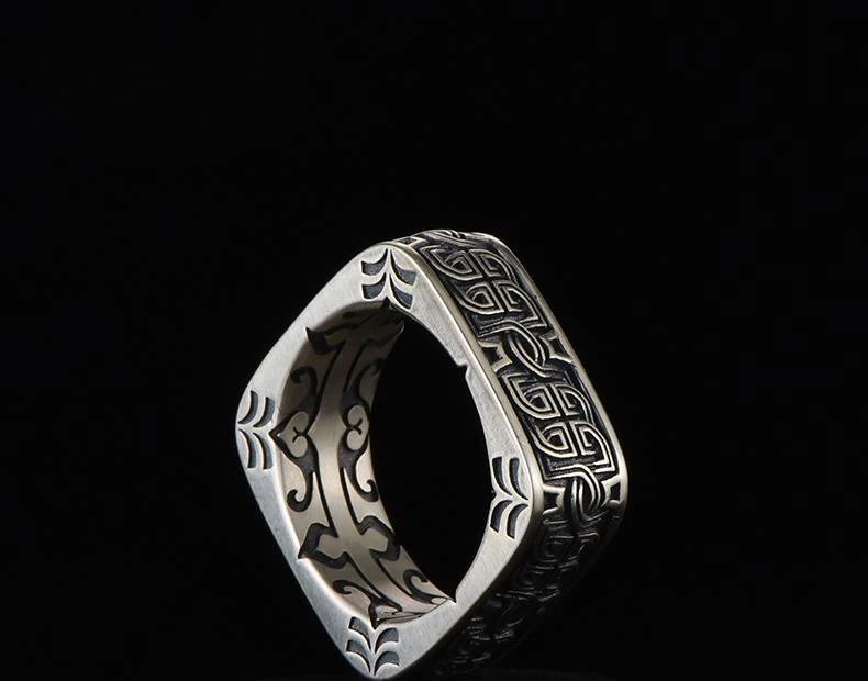 HX Silver Color Men’s Ring Retro Square Round Pangu Trend Personality Domineering Handmade Ring Jewelry Accessories