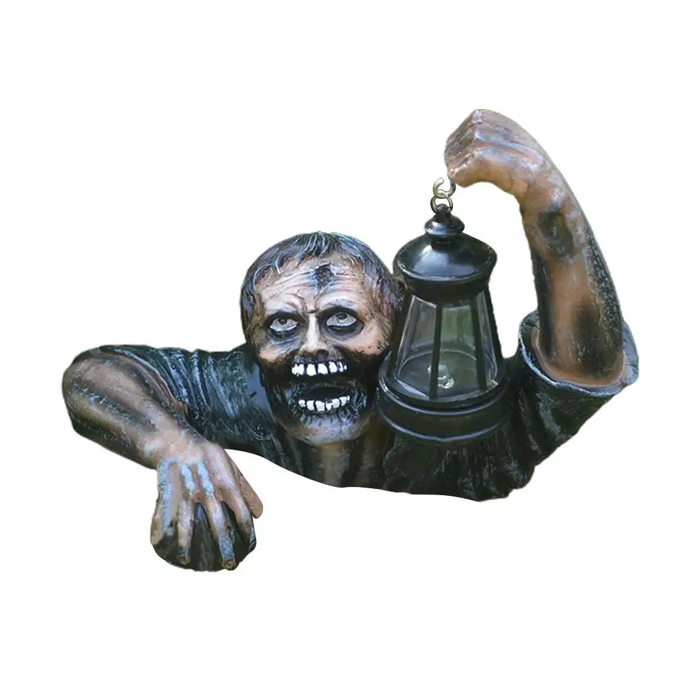 2. 【Zombie Holding Lantern】: This item depicts an Undead Zombie rising from his graveyard holding a Lantern. This item s detail is breath taking and will surely be the center piece of your indoor or covered patio space.This product uses button batteries and you can turn on the lights at night.